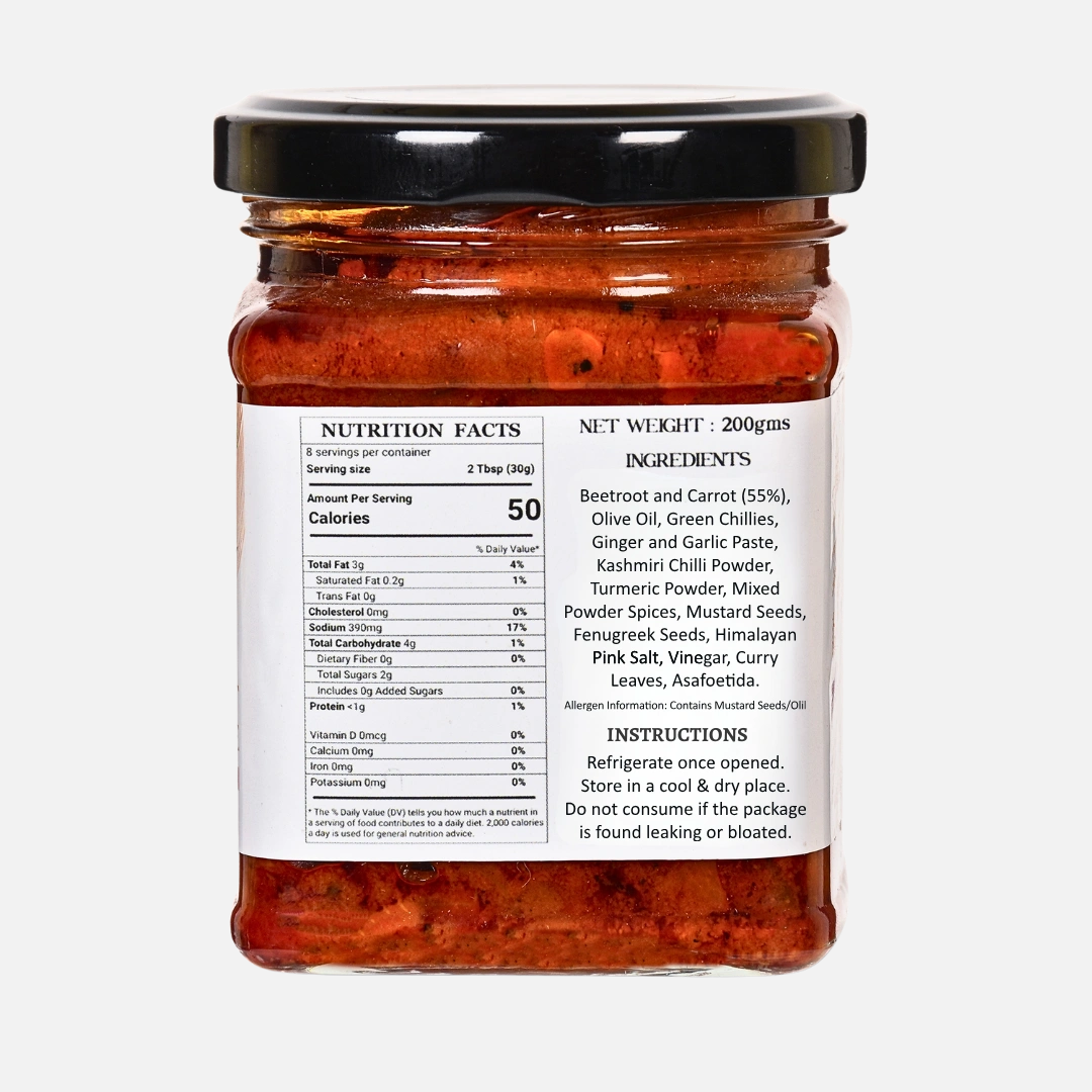 Introducing our Carrot and Beetroot Pickle—a master blend of earthy sweetness and tangy spices, infused in pure olive oil for a healthy and delicious treat. Free from additives and preservatives, it’s a perfect complement to your favourite dishes.